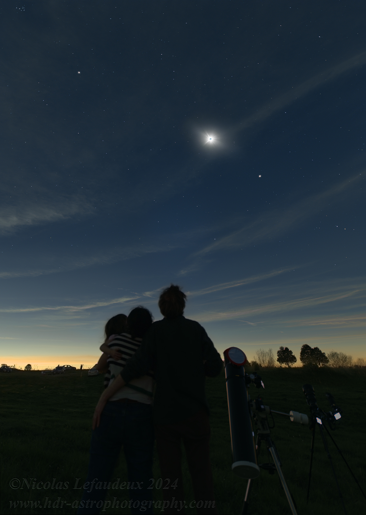 This is my final image of the 2024 eclipse. I wanted to make a nice memory image, with the eclipse in the sky, the surrounding landscape during totality with sunset colors, and my family and me in the foreground as we watch the eclipse unfold. The extended corona of the eclipsed Sun is visible, together with the solar system planets, and many stars revealed by the combinations of almost 500 frames with exposure 1/20s, 1/4s, and 1s at ISO 100 captured during totality with a Nikon Z6 and Sigma 14 mm f/1.8 lens used at full aperture.