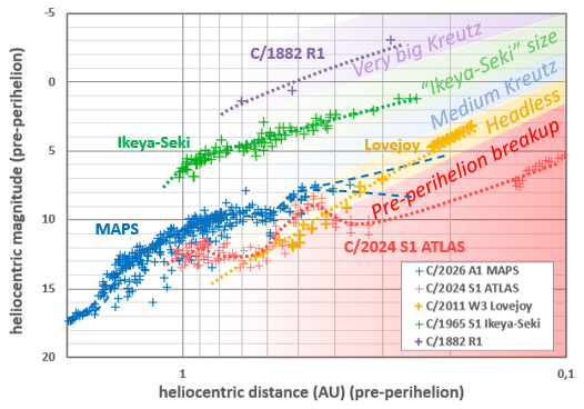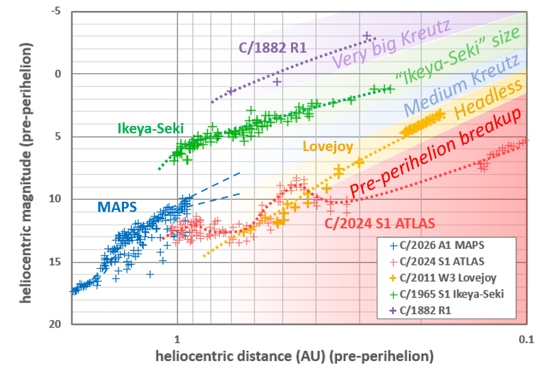 To assess which outcome is most likely, I made a plot showing the pre-perihelion heliocentric magnitude (which correlates with nucleus size) of comet MAPS and various Kreutz comets as a function of heliocentric distance. The plot highlights several possible scenarios depending on comet size.