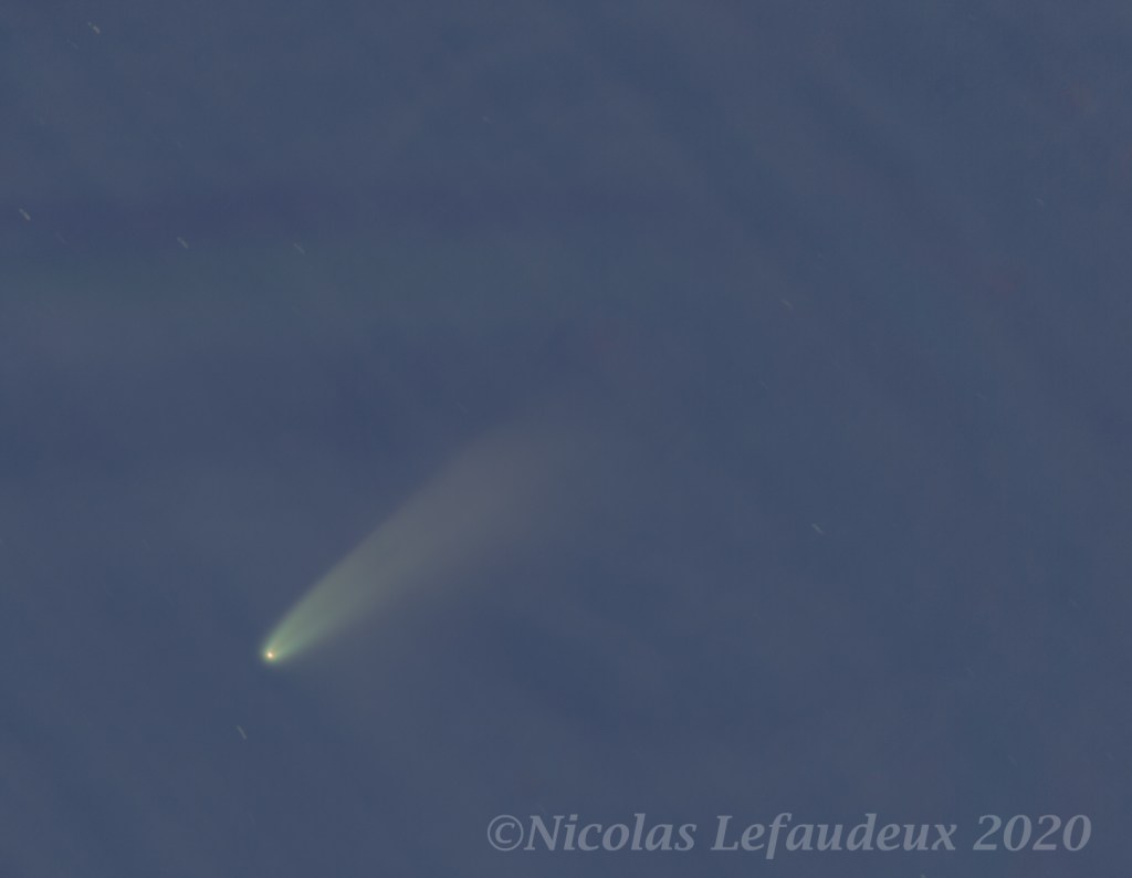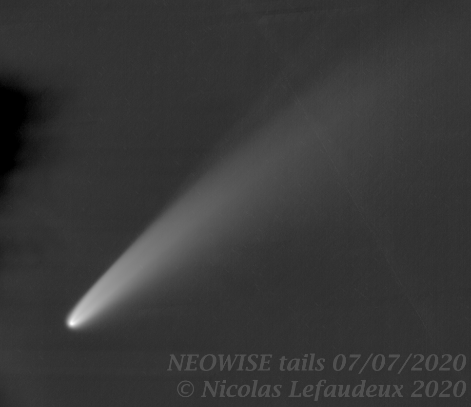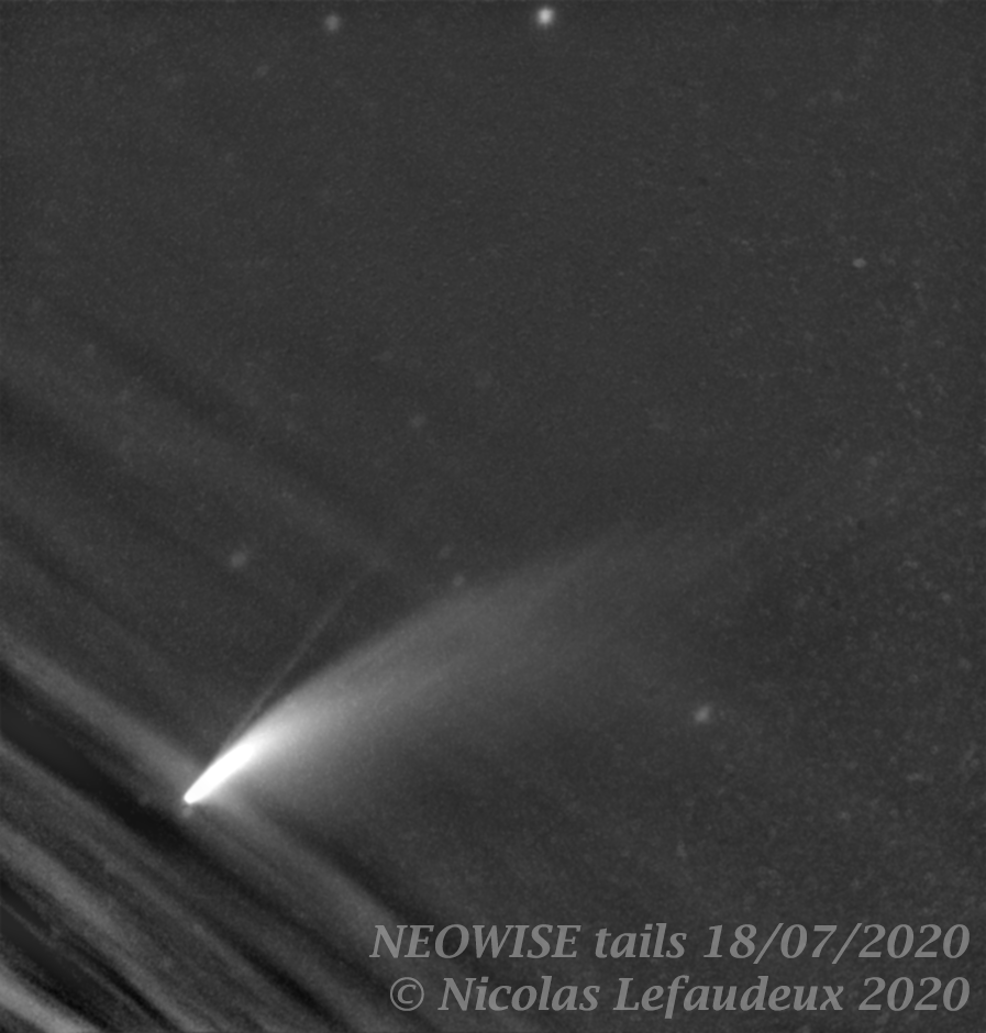 Visually, the comet has dimmed again since the 18th of July, making it a pale sight compared to what it was 10 days before. For imaging NEOWISE, I used 14mm focal length in order to capture the whole tail length, with a total exposure of 75 minutes. Yet, the choice of focal length was not the best, as using a 35mm focal length would have given a deeper image and more length probably. The tails lengths are indeed similar to images of the 18th of July, with dust tail reaching 25° length, and the ionic tail going up to 40° or 45°. The sodium tail is not be detected, probably both from the fact it dimmed, and also because of the use of a shorter focal reduced too much the signal to noise ratio.