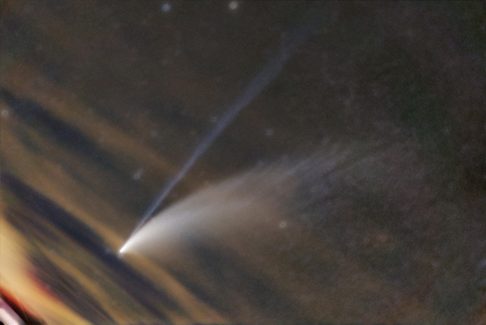 The image reveals the complex tail structure of the comet: a large, fanned dust tail with beautiful synchronic striation, the blue ion tail tails with blue gaseous wisps, and the rare red “sodium” tail.