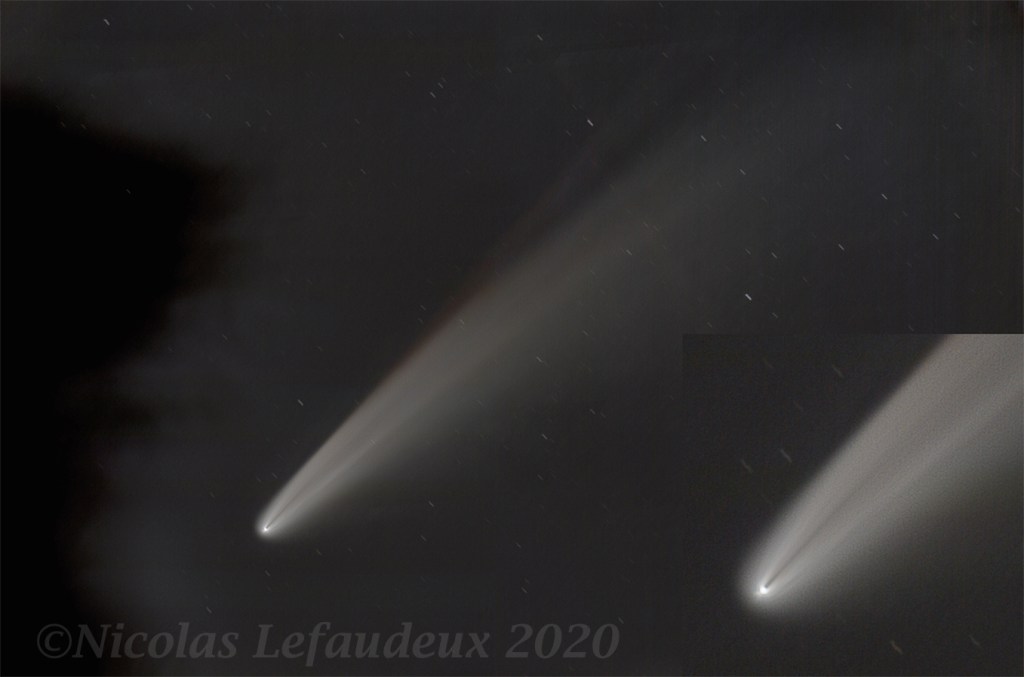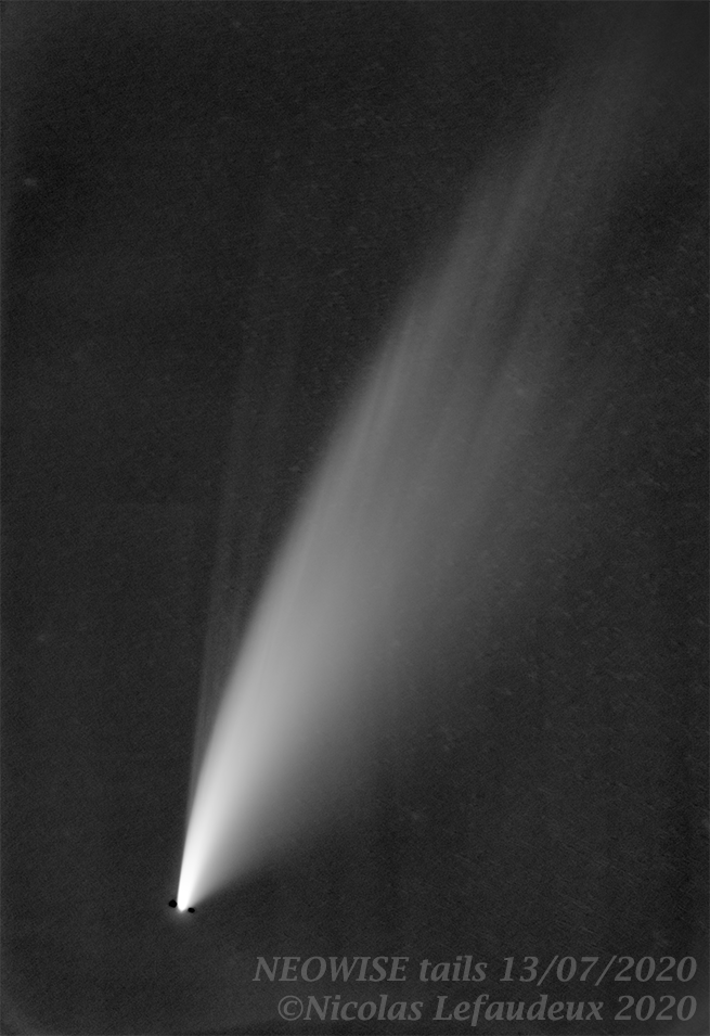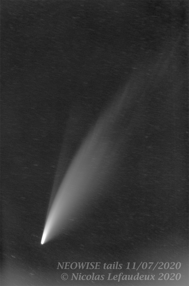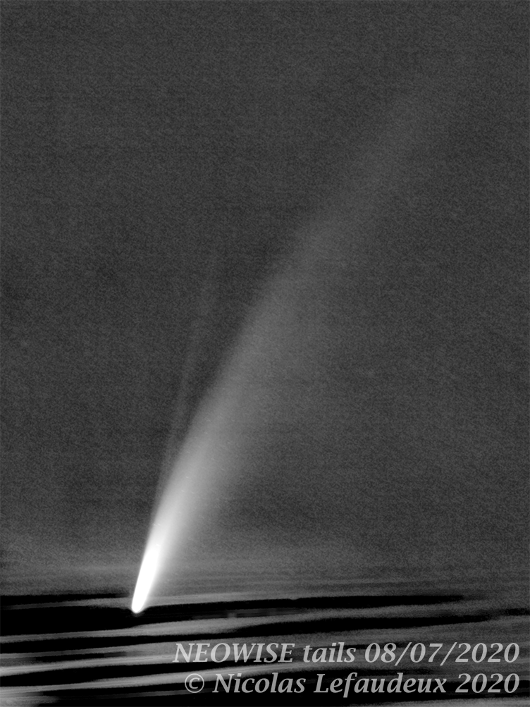 Excellent set of images. The observation was made from the Northern coast of Finistère with the comet above the ocean, and absolutely no light pollution. The view was just spectacular to the eye, and with the 100mm binoculars. The tails of comet NEOWISE go out of the frame, which means the tails longer than 10°.