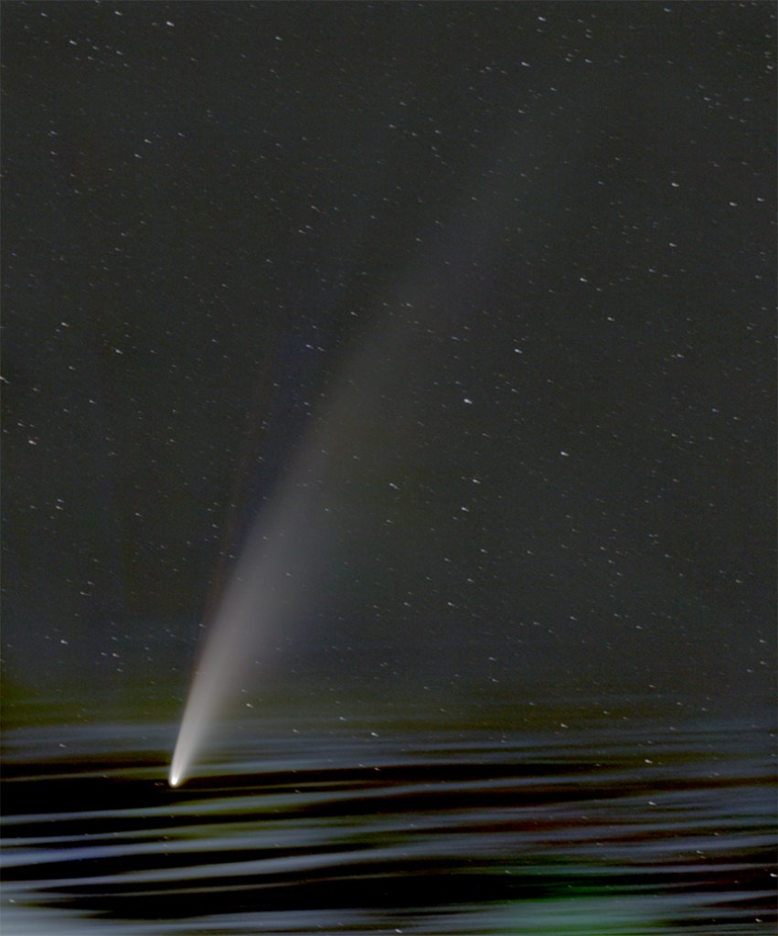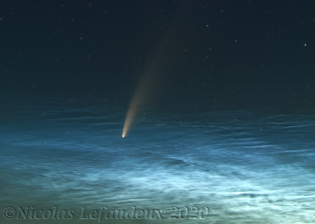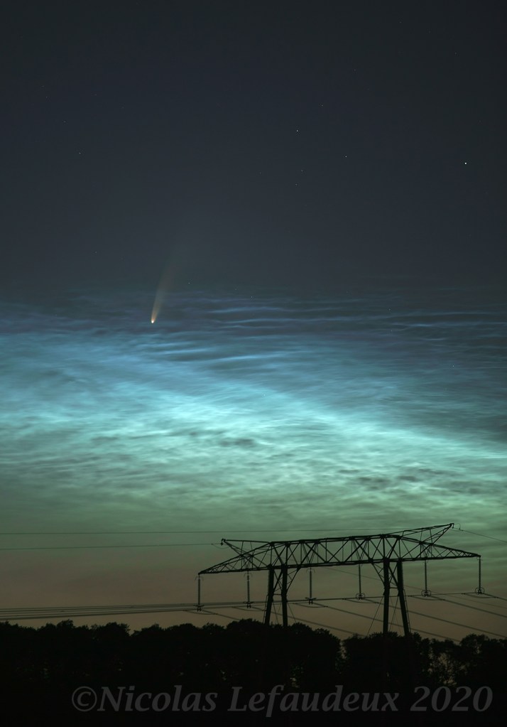 Wonderful sight of the comet NEOWISE with bright noctilucent clouds! The color contrast between the electric blue noctilucent clouds and the yellow comet was striking!