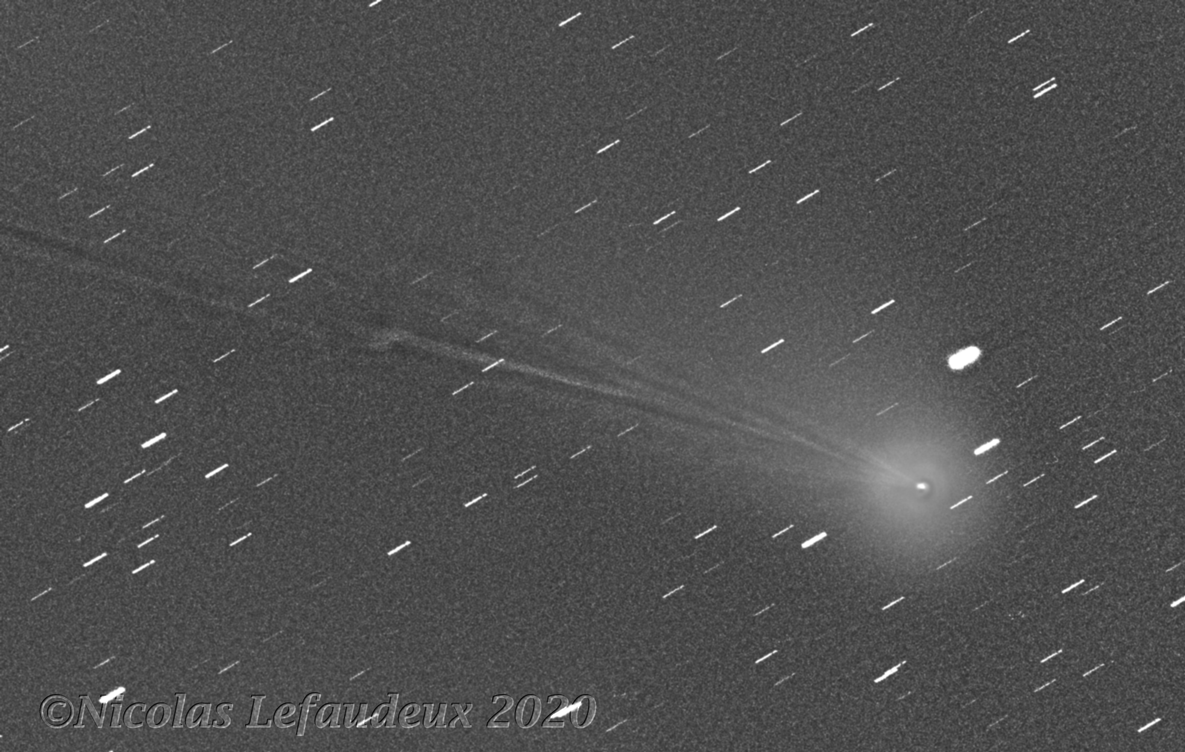 NEOWISE with Maksutov Newton telescope, imaged during 1h30minutes, showing a spiral jet rotating around the nucleus of the comet, and structures in the ion tail drifting along the tail, blown by the solar wind.