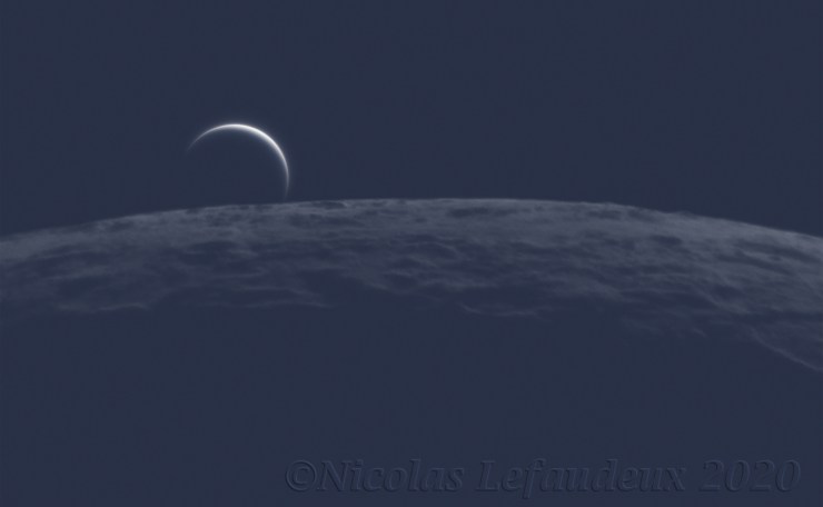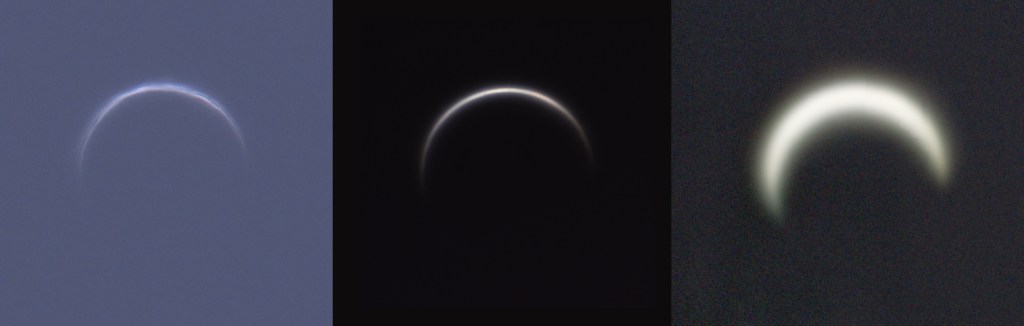 In 2023, Venus went again in solar conjunction, but at a much larger solar elongation of 8°. With such elongation, the crescent is barely longer than the “normal” 180°. I had not planned to observe this conjunction, but claimed observations of the Venus ring by Didier Favre prompted my to check myself. With the reasonnable elongation of 8°, to maximize the chance, I used my 190mm diameter Maksutov Newton telescope. As I expected, the ring was not observable and the crescent was barely longer than 180°. Even other observers who made much better captures than mine and Favre’s like these from Wah-Wah did not capture Venus ring. Needless to say that, either the thickness of the atmosphere of Venus had changed just at the time Favre’s image, or …