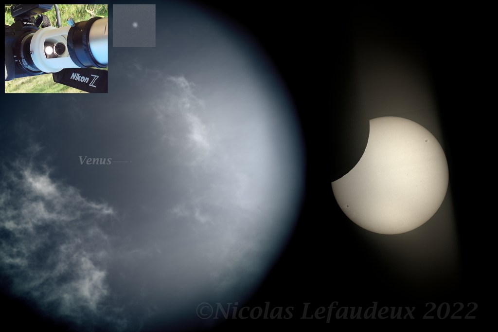 During the Solar Eclipse, planet Venus was nearby, hidden in the sun glare. To capture both the eclipse and Venus, I used a special filter located near the camera, with reflective coating removed on a circular area to be able to have an unfiltered view of venus while getting the required filtration for the eclipse. A 3D printed part allowed to get the reflected beam of sunlight outside of the telescope. The high clouds dramatically decreased the contrast of the planet and made the image quite tricky to get. I had to wait for some clearer break in the clouds to be able to spot Venus in the zoomed image of the camera.