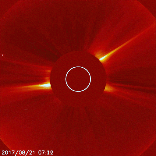 Left (high res here): SDO spacecraft animation (AIA304) showing the dissipating prominence at the time of the eclipse. The last debris of the prominence are visible on the high resolution image I obtained and the animation below . Right (high res here): SOHO spacecraft animation (LASCO C2) showing the CME on the left quadrant during the eclipse that is easily visible on the high resolution image and animation. Another weaker CME on the upper right quadrant is visible before the eclipse. It shows up as some irregular structure alike a turbulent flow on the color composite.