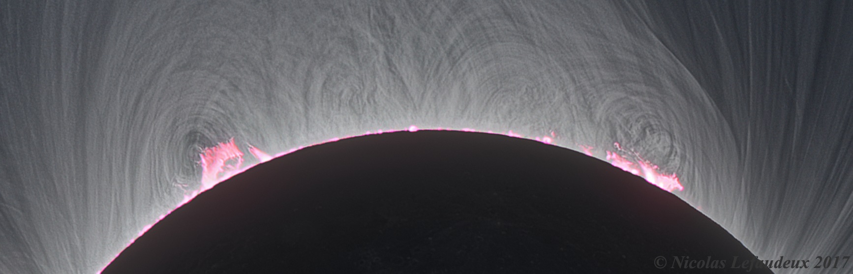 Composite 2017 Eclipse (high res here): the image is a high resolution composite of more than 70 images acquired with different exposure time. With its high resolution (< 2 arcsec details) over a large 2°x1.5° field of view, this image might be the most detailed image of a solar eclipse ever produced.