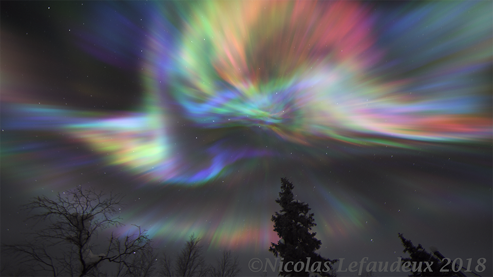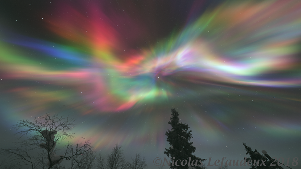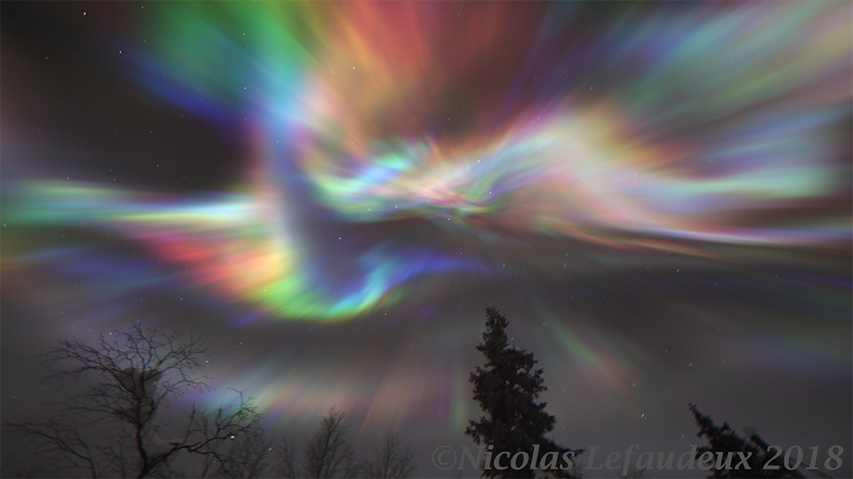 The dance of the aurora is a magical sight impossible to depict on still images. I tried to translate the motion of the aurora in color with a processing consisting in assigning a dedicated color to the frames of my Aurora video, before stacking them. The results are false color images where the hypnotic dance of the auroras are translated into eerie fireworks of colors. You can see some more usual of my images of northern light images here.