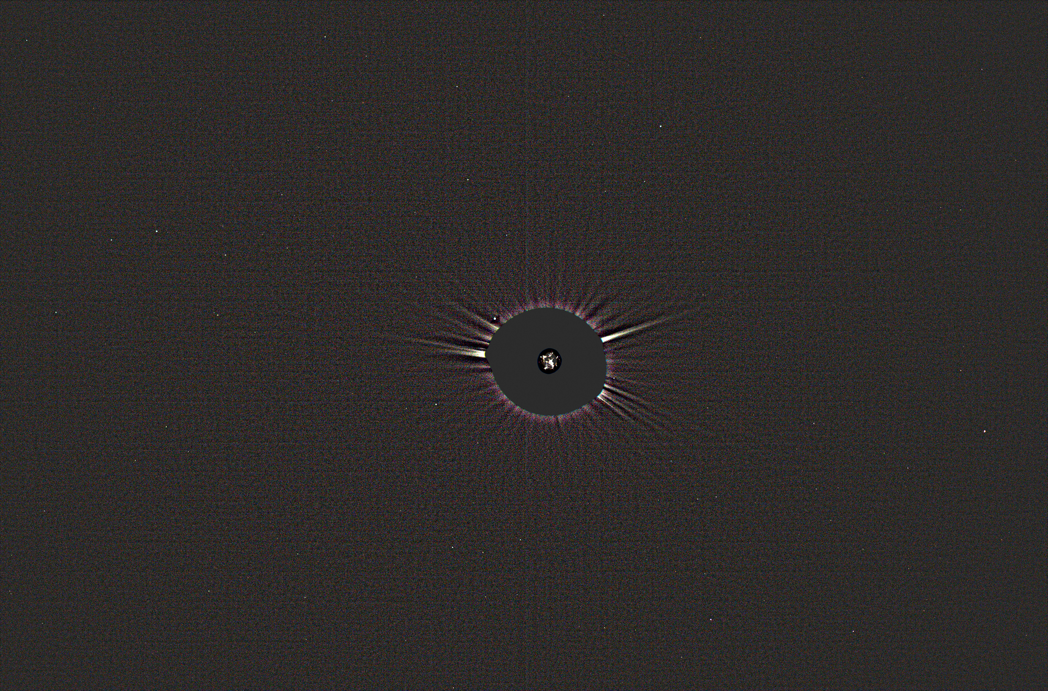 Black and white image before enhancement showing the full extend of the solar corona (high res here) going as far as ~30 solar radii, and hundreds of background stars down to magnitude 11.