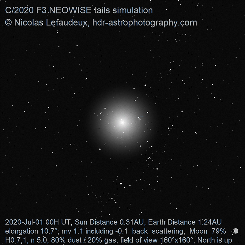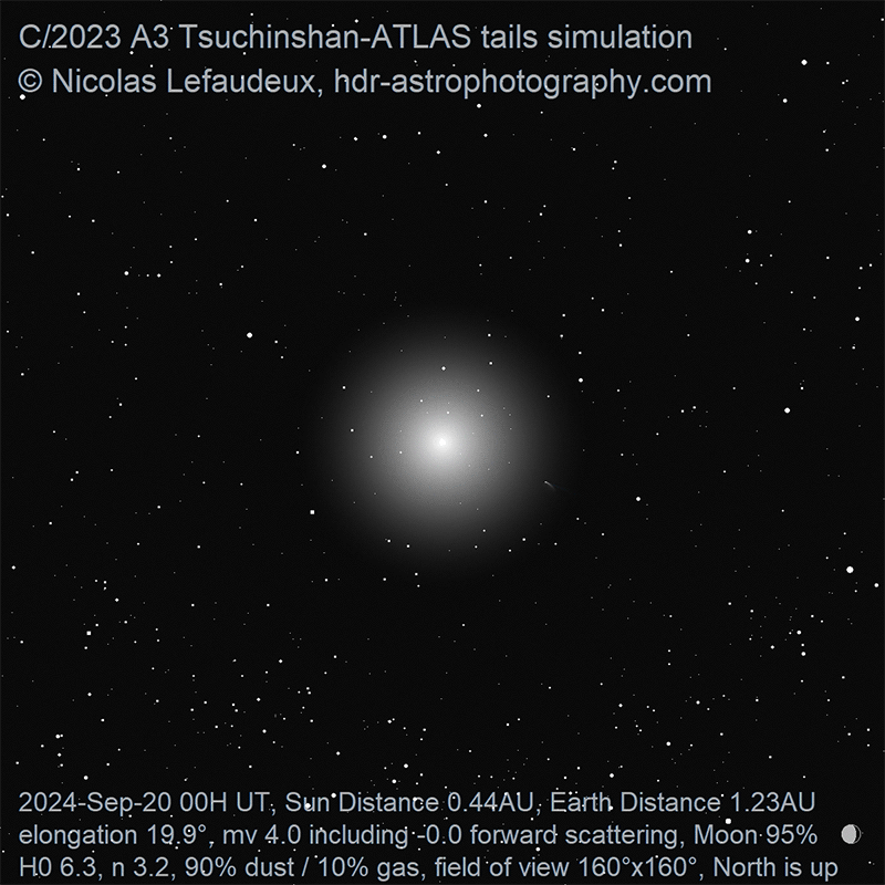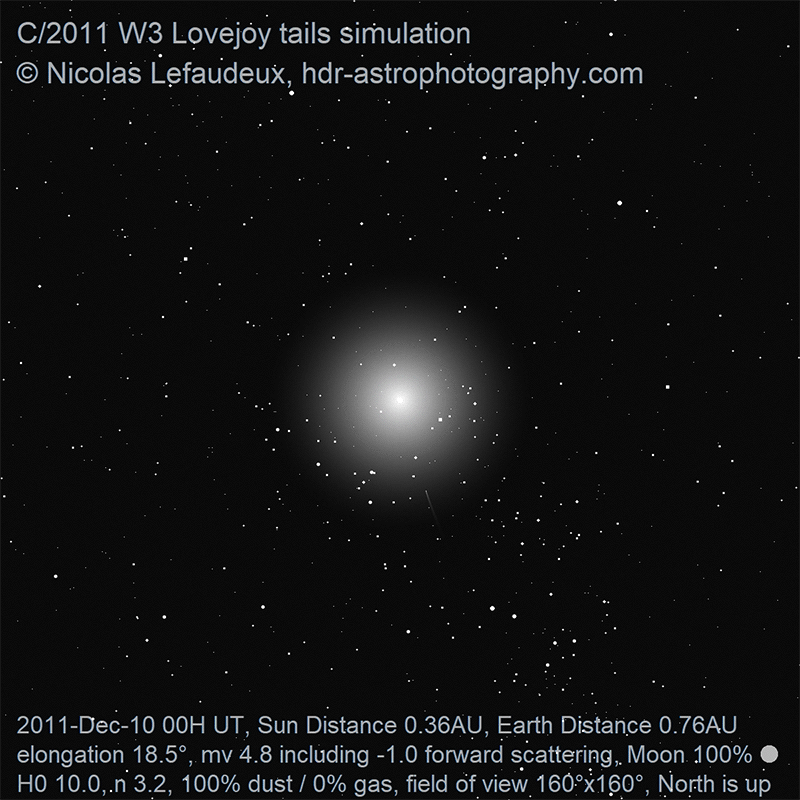 The simulation below have been updated taking into account that the antitail appeared not to have been enhanced with foward scattering, while the initial simulations published at the time of the comet appearance had the antitail tail enhanced by forward scattering and thus significantly stronger than it actually was.