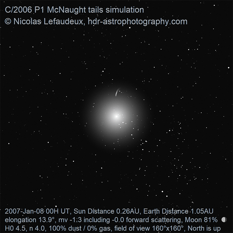 The simulations confirm how extraordinary comet McNaught was, and allows to identify correctly the highlight of the display between January 19th and January 25th. The main features are correctly simulated, with extensive but short-lived dust tail, with some parts visible from the northern hemisphere, and the strong striations present in the dust tail.