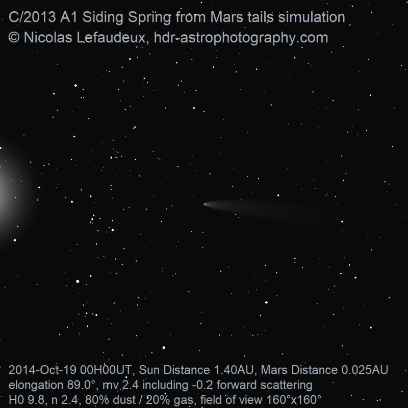 Small comet 2013 A1 Siding Spring had a record-breaking close encounter with Mars on October 19th 2014 at a distance of only 0.0007 AU. The simulation shows how fast the appearance of the comet must have been from Mars. The comet was brighter than magnitude 2 for only a bit more than 24hours, and the highlight of the apparition lasted no more than 6 hours!
