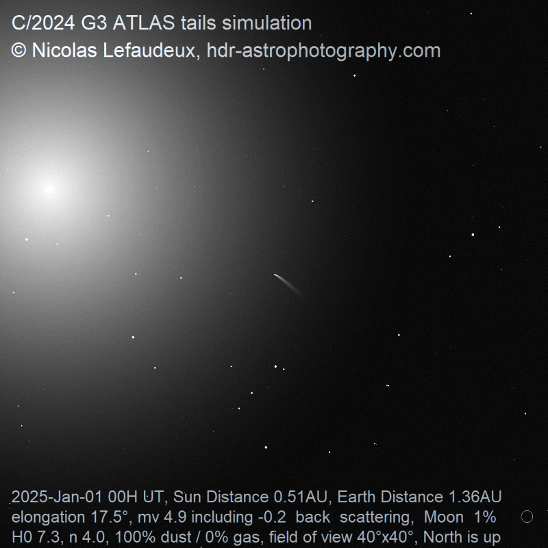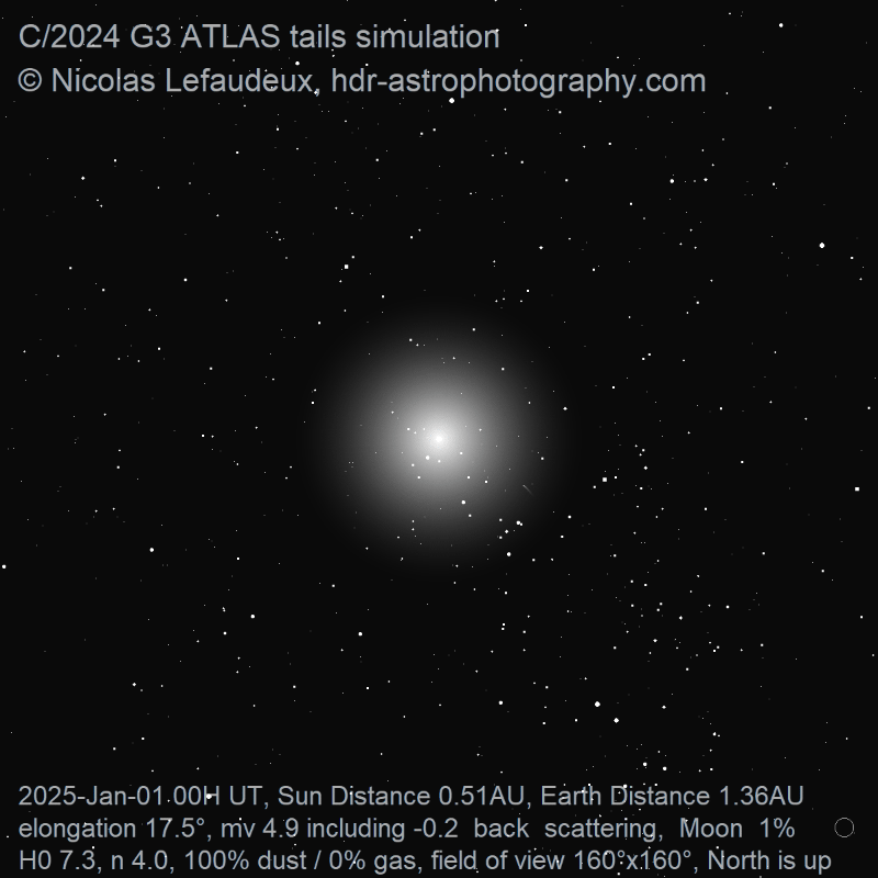Despite unfavorable viewing circumstances, comet C/2024 G3 ATLAS gave a very nice display, likely the finest since comet McNaught in 2007. It was visible almost exclusively from the southern hemisphere. The comet underwent 2 main outbursts. The first outburst was about 2 magnitude that happened between January 2nd and 3rd and lasted for several days. A second outburst happened just after perihelion on January 15th and that probably lead to the subsequent disintegration of the comet that became obvious on January 19th. The simulation takes into account these outburst and disintegration of the comet by a time-varying absolute magnitude of the comet H0.
