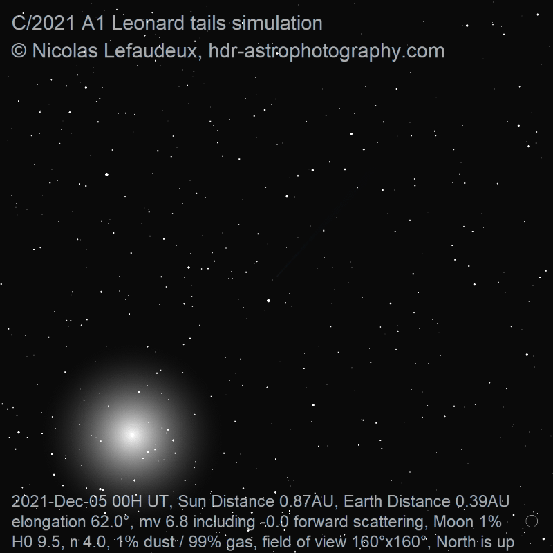 The simulations do not quite fit the behavior of comet Leonard. The main reason is that it seems that before outburst, the comet was less gaseous and did not exhibited a strong ion tail, while it became much more gaseous after the outburst. Such time-varying composition is not handled with the tail simulation program, so before the outburst, the gas tail visibility and length is overestimated. After the outburst and December 21st, this is quite the opposite as the simulation renders a maximum tail length around 40° decreasing to around 20° on December 29th while the gas tail was recorded to be the longest on December 29th at 60°. Although this can be attributed to daily variations of the tail length, globally the simulation still underestimates the maximum possible tail length after December 21st.